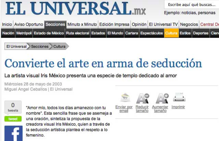 Publication in Spanish: Ceballos, Miguel Ángel. (28 mayo 2003). Convierte el Arte en Arma de Seducción. El Universal. Cultura. México.