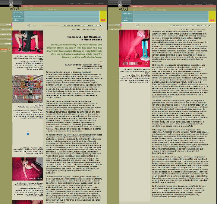 Giménez, Fabián. (2005) Hipersexual: Iris en la Fiesta del Sexo. Instalación y performance en el 1o y 2o Festival de Cine Erótico en México. (artes visuales, conceptuales, escénicas). Revista Discurso Visual. Cendidiap. INBA https://discursovisual.net/dvweb04/diversa/divexpgimenez.htm